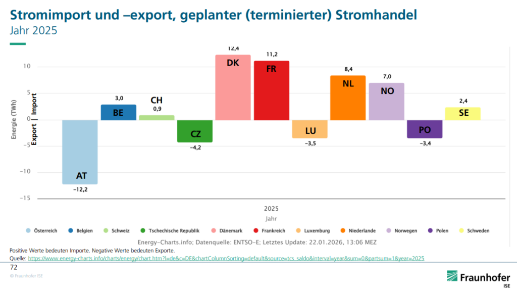 Die nachfolgende Grafik zeigt diesen europäischen Stromhandel sehr deutlich. In 2025 haben wir Strom aus Dänemark, Frankreich oder Niederlande importiert (Balken nach oben) und nach Österreich oder Luxemburg exportiert (Balken nach unten) [5].