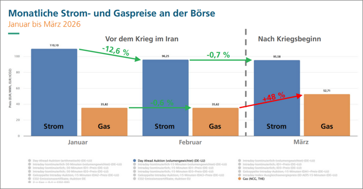 Mit den Erfahrungen aus dem Ukraine-Krieg 2022 musste jetzt durch den Iran-Krieg wiederum mit einem Anstieg der Strompreise gerechnet werden, Öl- und Gaspreise sind durch die erzwungene Knappheit massiv gestiegen.