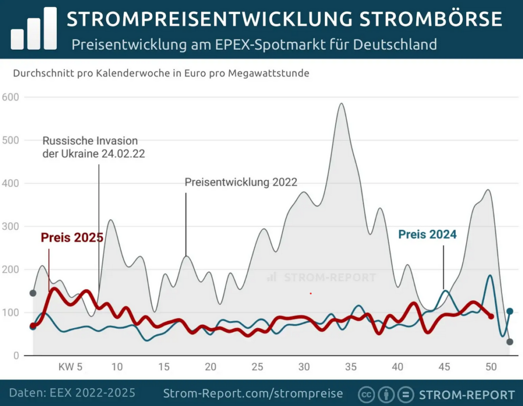 Nachfolgende Grafik zeigt die an der Börse gehandelten Strompreise für die Jahre 2022 – 2025 [2]. In den letzten 3 Jahren schwankten die Strompreise zwischen 36 Euro und 586 Euro pro Megawattstunde (entspricht 3,6 – 58,6 ct/kWh).