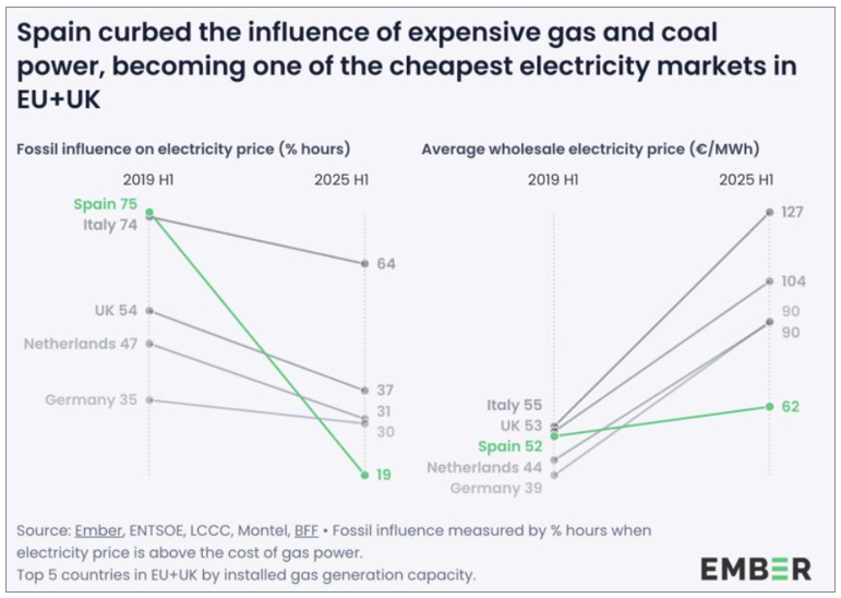 In Spanien hat die konsequente Ausrichtung auf Erneuerbare Energien dazu geführt, dass diese Land nun zu den günstigsten Elektrizitätsmärkten in Europa inkl. GB gehört und seine Abhängigkeit von Öl und Gas drastisch verringert hat [35].