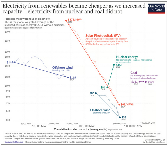 Erneuerbare Energien sind heute deutlich günstiger (positive Lernkurve, d.h. geht nach unten), die Kosten für Kernenergie sind gestiegen (negative Lernkurve), die Preise für Kohleverstromung (Coal) haben sich kaum verändert.