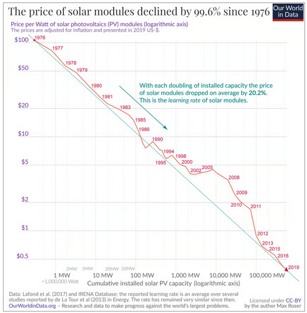 Das entscheidende Stichwort ist die sogenannte „Lernkurve“, die zeigt, wie schnell sich die Kosten von Jahr zu Jahr verringern. Die folgende Grafik zeigt die steile Lernkurve bei den Solarmodulen, wonach der Preis von 1976 bis 2019 um 99,6% gesunken ist [29]. Nach 2019 ging es bekanntlich genauso weiter. Die Kosten für Li-Ionen-Batteriespeicher sind von 1991 bis 2024 um 99% gefallen [30].