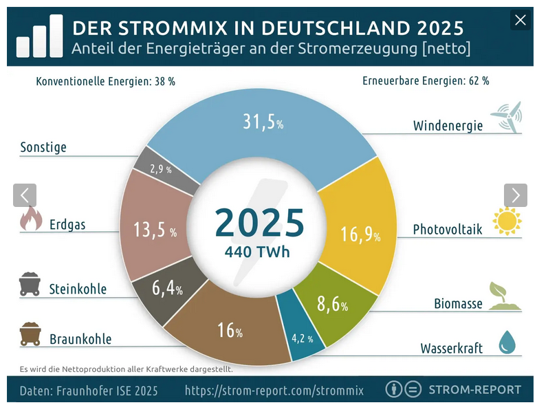 Die Erneuerbaren Energien (Wind, Sonne, Biomasse, Wasserkraft)  besitzen 2025 einen Anteil von 62% (netto), die konventionellen bzw. fossilen Energien 38% (Gas, Kohle, Öl).