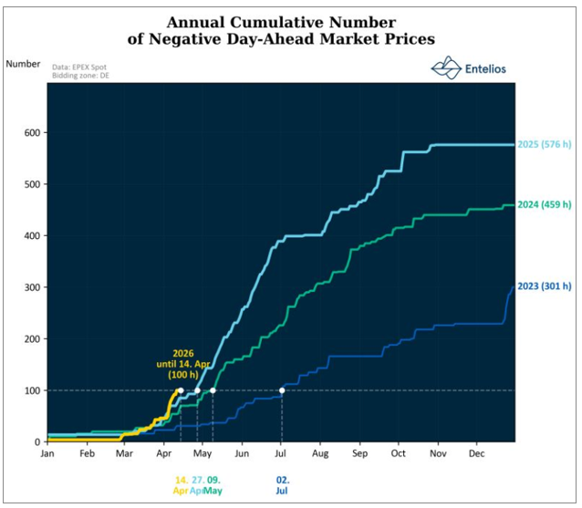 Wird mehr Strom erzeugt (angeboten), als von den Netzen verbraucht (aufgenommen) wird, resultieren negative Strompreise. Tatsächlich ist deren Anzahl in den letzten Jahren gestiegen, wie die nachfolgende Grafik zeigt [56].