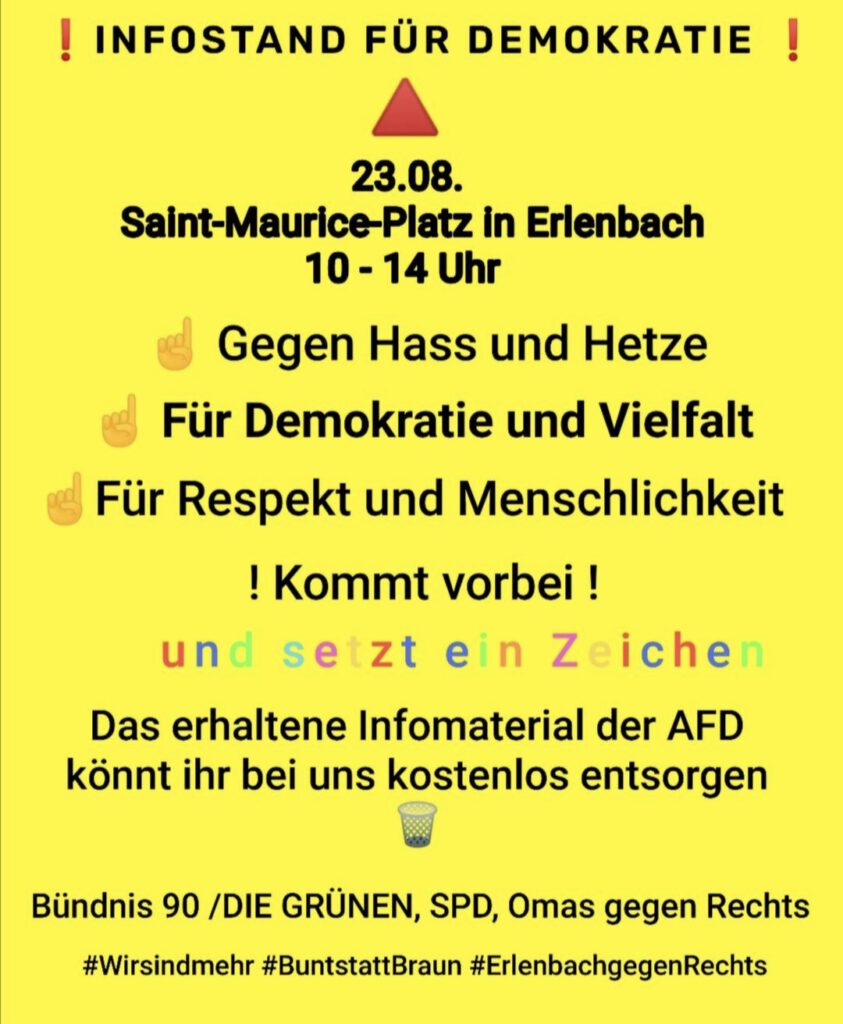 Wir sind mehr, Wir sind bunt und wir setzen ein Zeichen gegen Hass und Hetze, für Demokratie und Vielfalt, für Respekt und Menschlichkeit und ein klares Nein zur AfD in Erlenbach – kommt vorbei !!
